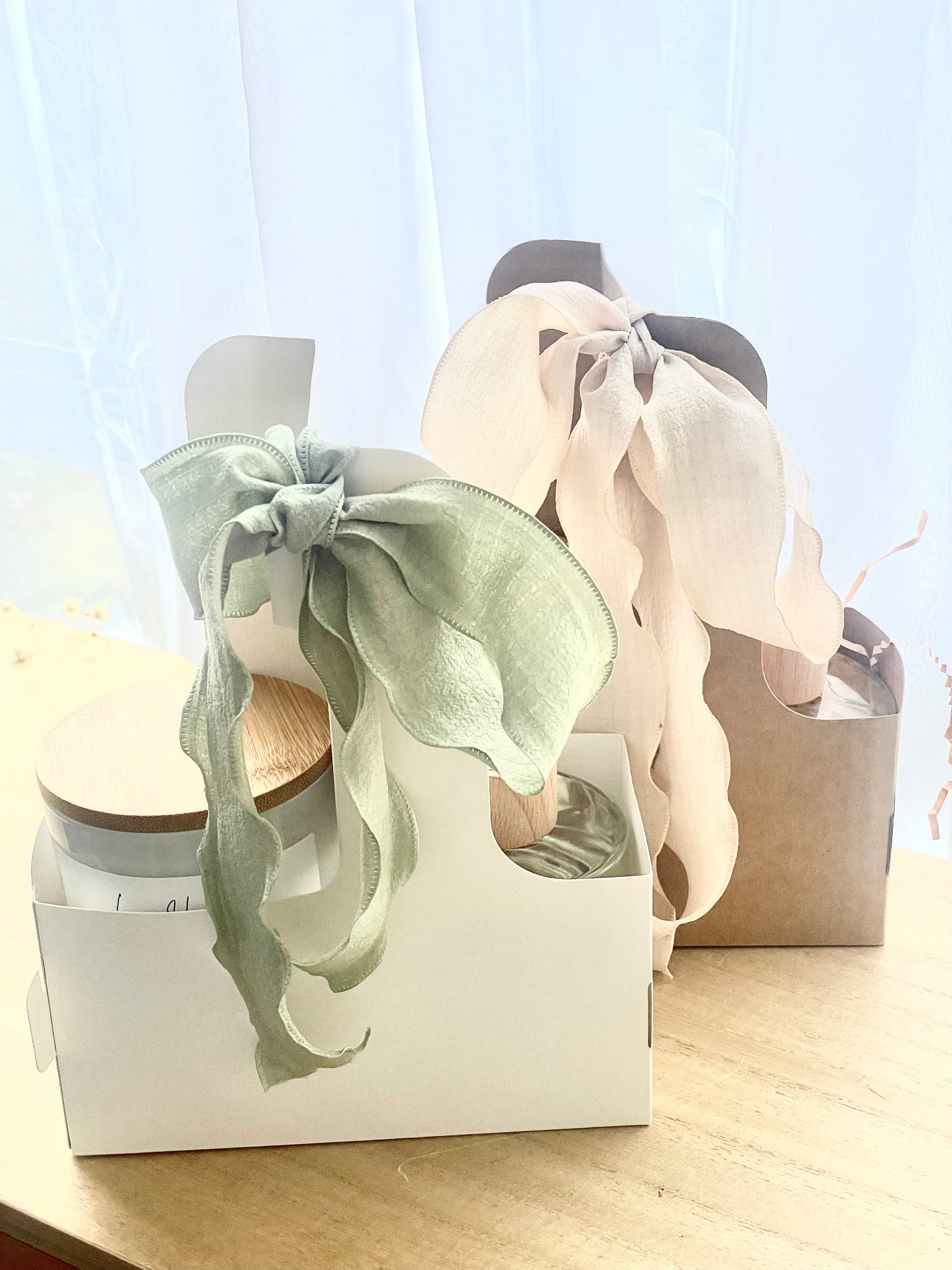 Two packaging optional available, white with green ribbon and Brown with beige ribbon.
